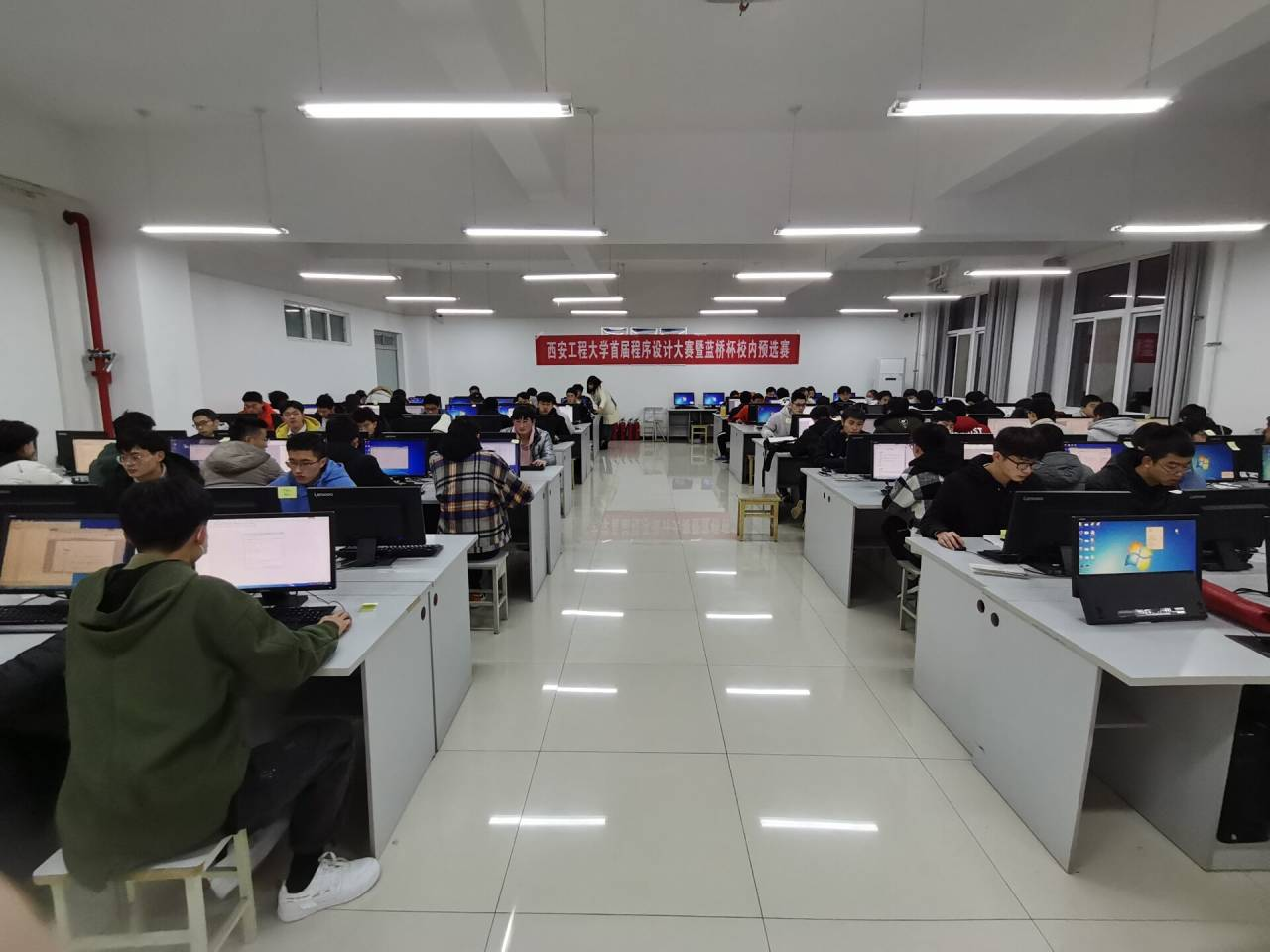 本次程序设计大赛具有较强专业性,比赛面向best365官网全体本科生,共计有二百余位参赛人员,整个考场座无虚席。同时此次大赛支持参赛者选用C、C++、Java、python中任意一种语言参赛。在考场中,参赛者们认真思考,沉着应战,比赛紧张而有序地进行着。监考员秉承着公平,公正,公开,决不能有弄虚作假的态度监考。两个小时后,紧张的比赛终于接近了尾声,在参赛者与监考人员的配合下,此次大赛圆满结束。