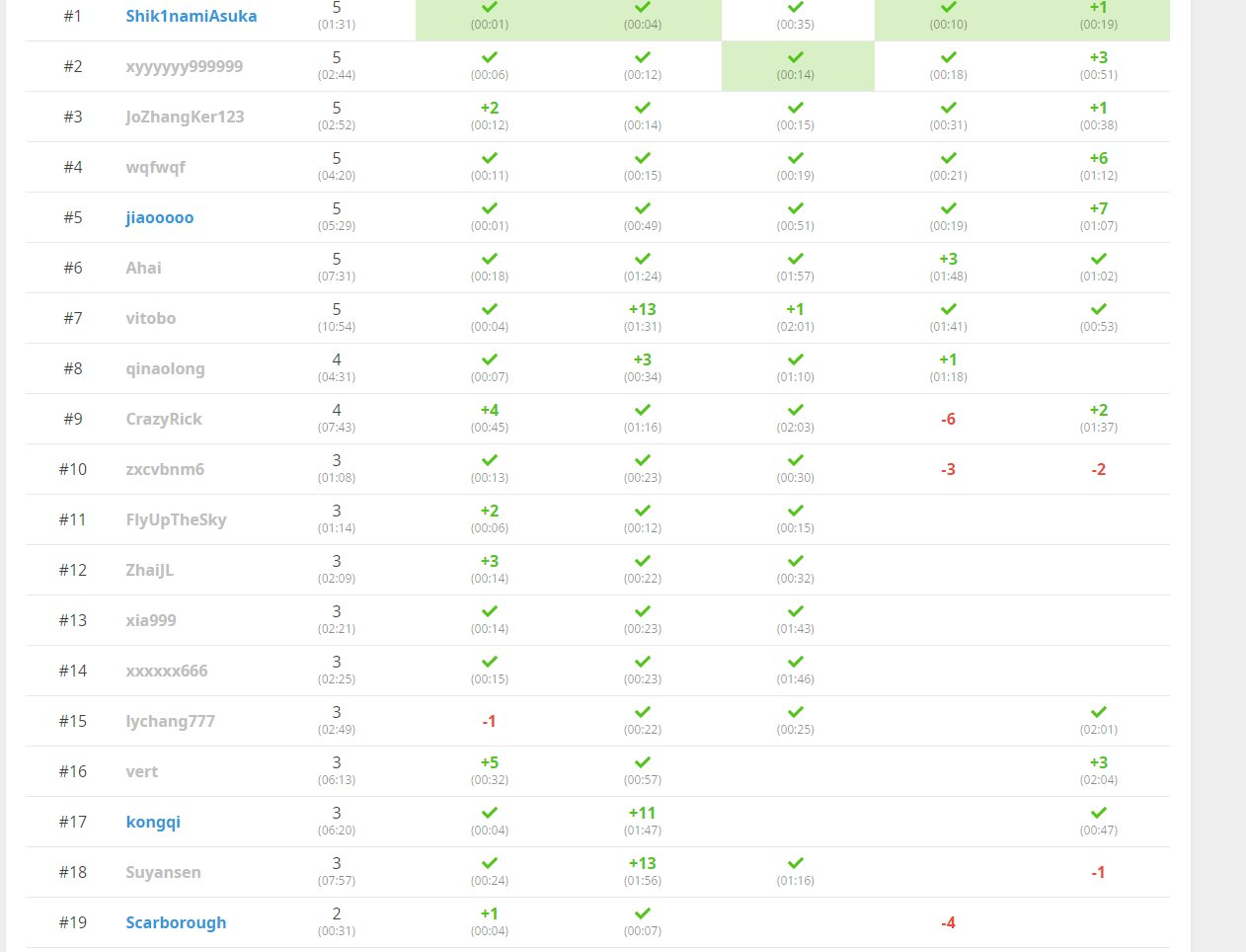 参赛选手使用自己的账号登录比赛系统,用C++、java、python等语言,进行网上答题。大赛一共有5题,参赛者的答案提交后,系统按照每位参赛选手所答题目数量、答题时间、错误率等多个限定条件,依次排出参赛选手的名次,题目通过情况和得分会在计分板上实时公布。经过两个小时激烈角逐,徐浩闻获得了一等奖,焦子逊等5名同学获得二等奖,常露予等15名同学获得了三等奖。赛后,相关负责人在交流群内发布了编程赛题解。