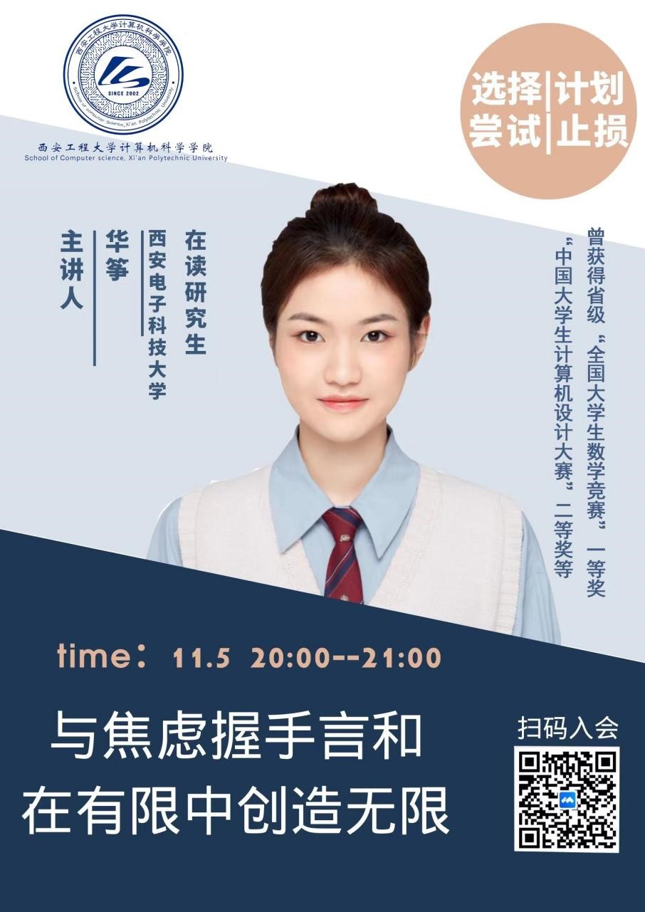11月5日晚,best365官方网站登录入口组织召开了2022年“与焦虑握手言和,在有限中创造无限”宣讲会,旨在提倡我院学生克服焦虑。本次分享会邀请了2022届毕业生华筝分享自己的学习经验,并现场答疑解惑。全体辅导员参会,会议由朱成功主持,共有300余名学生参加。