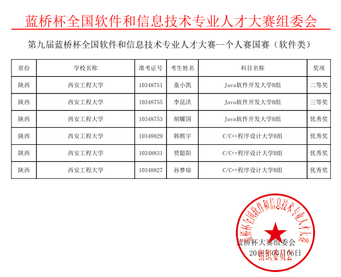 “第九届蓝桥杯全国软件和信息技术专业人才大赛”全国总决赛于5月26日在北京隆重举行,来自千余所高校的5000余名蓝桥杯省赛一等奖选手云集京城,角逐蓝桥杯最高荣誉。best365官方网站登录入口高晓娟老师、王爱丽老师带领着6位同学参加C/C++程序设计和JAVA软件开发全国大赛。最终,童小凯获得了JAVA软件开发二等奖,李昆洪获得JAVA软件开发三等奖,胡耀国获得JAVA软件开发优秀奖,韩熙宇、贾聪阳、孙梦琼分别获得C/C++程序设计优秀奖。