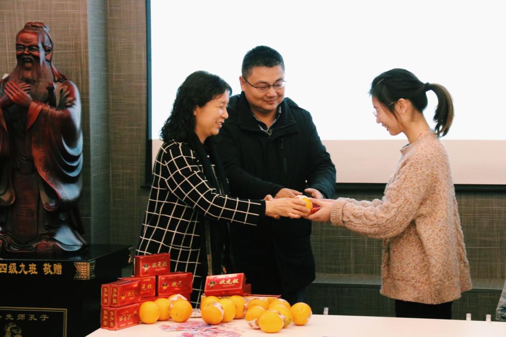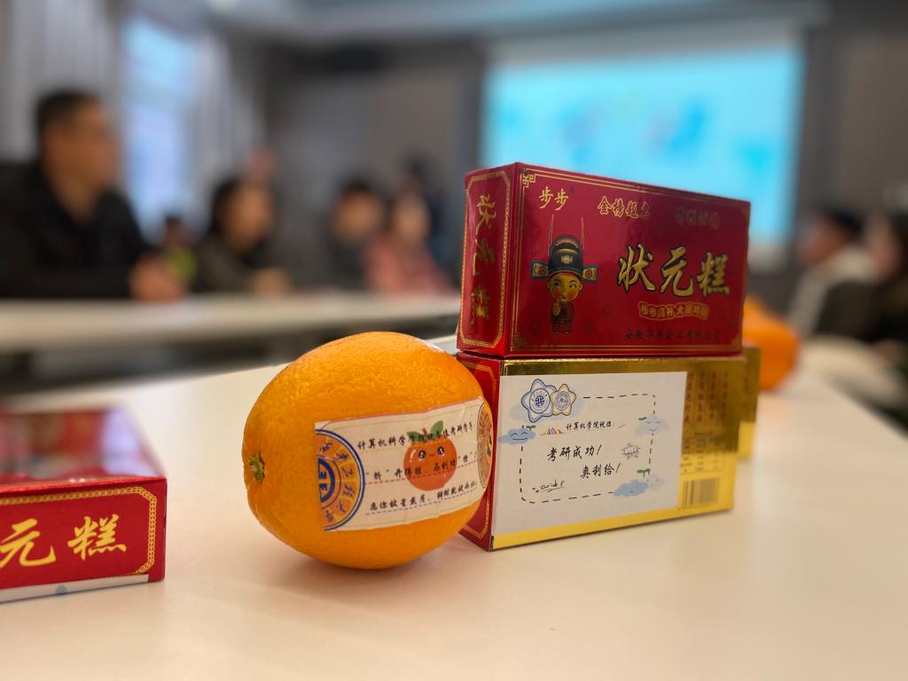 动员会的最后,学院领导共同为每一位考研学生送上了学院精心准备的加油包。里面包含了“时时好运 步步高升”状元糕、承载学弟学妹寄语的“考研必胜”加油卡以及寓意“脐”开得胜,马到功“橙”的脐橙,以此来助力考研学子,为他们打call,为他们加油,祝福他们取得优异成绩!(撰稿:张鑫 审核:王雅慧)