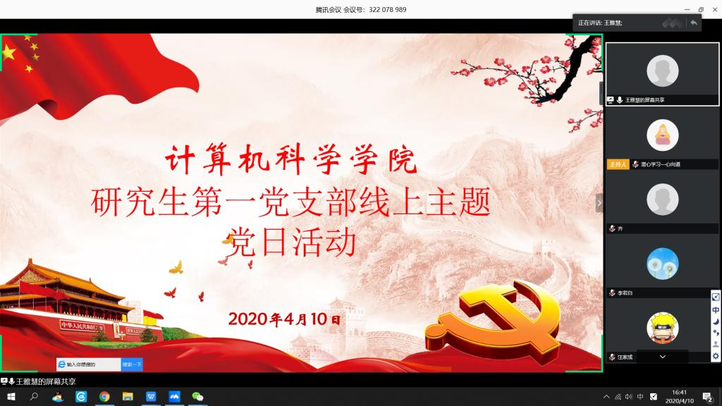 为深入学习贯彻习近平总书记关于疫情防控重要讲话、重要指示批示精神,积极响应陕西省委和校党委号召开展向“三秦楷模”等先进人物和先进集体学习的活动。4月10日下午,best365官方网站登录入口研究生第一党支部利用网络平台开展线上专题组织生活会和主题党日活动,支部全体党员参加,会议由党支部书记王雅慧主持。