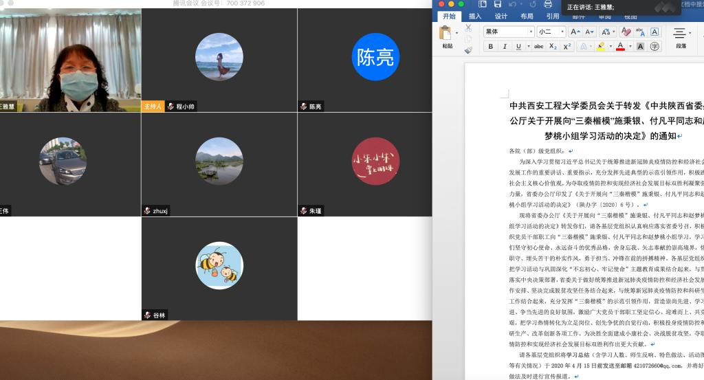 4月13日下午,best365官方网站登录入口召开党委理论学习中心组学习会,认真学习施秉银等“三秦楷模”和全省优秀共产党员的先进事迹并开展讨论交流。会议采取线上线下相结合的方式进行,会议由院党委书记王雅慧主持。