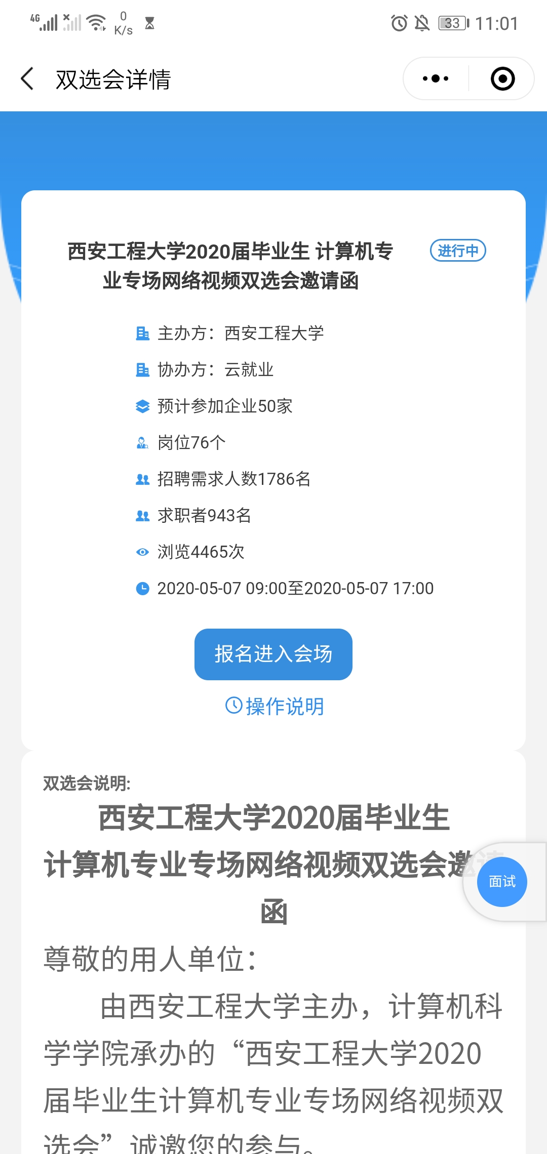 经过前期认真细致的筹备,此次双选会共吸引来自计算机行业领域的27家用人单位参加,实际提供各类岗位76个,共吸引1129名求职者参与,双选会在线浏览量达5600余次,达到了预期效果。