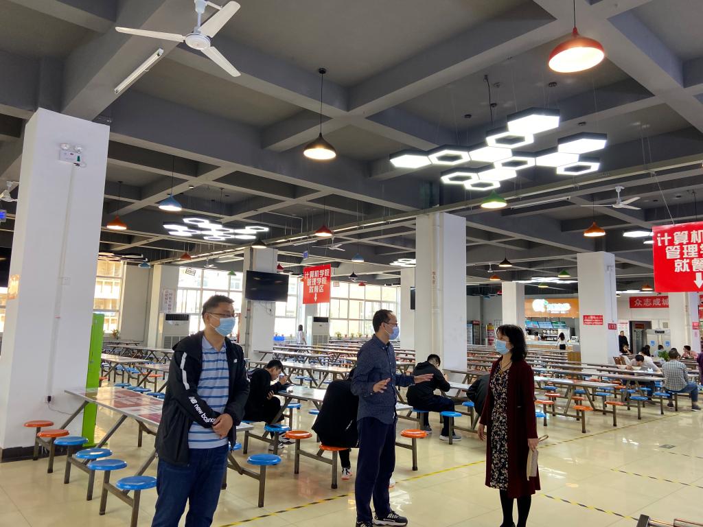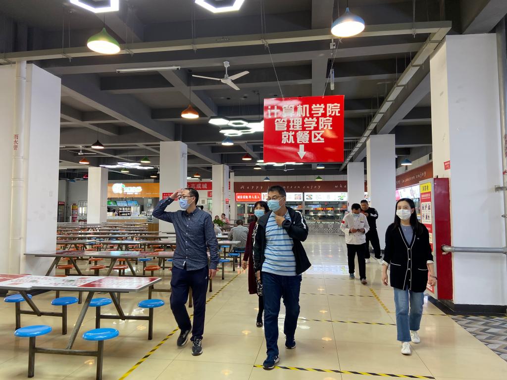 5月11日上午,院领导和辅导员又来到学院学生的定点堂食餐厅进行了防疫安全检查。在现场,对学生就餐聚集的人群进行了疏散教育,并就学生堂食就餐的注意事项与食堂负责人进行了深入的沟通交流,以期合力管控好学生的有序用餐。