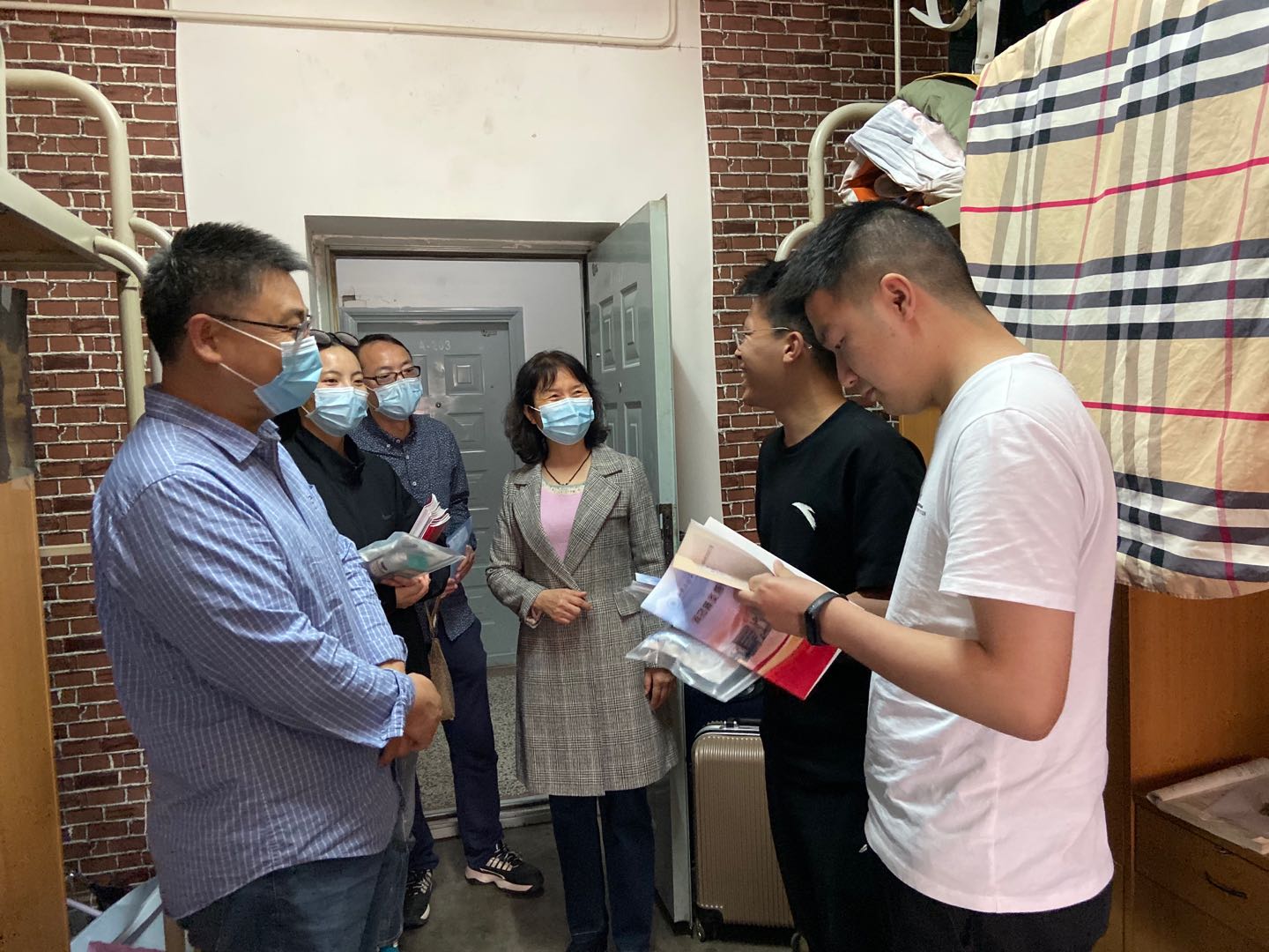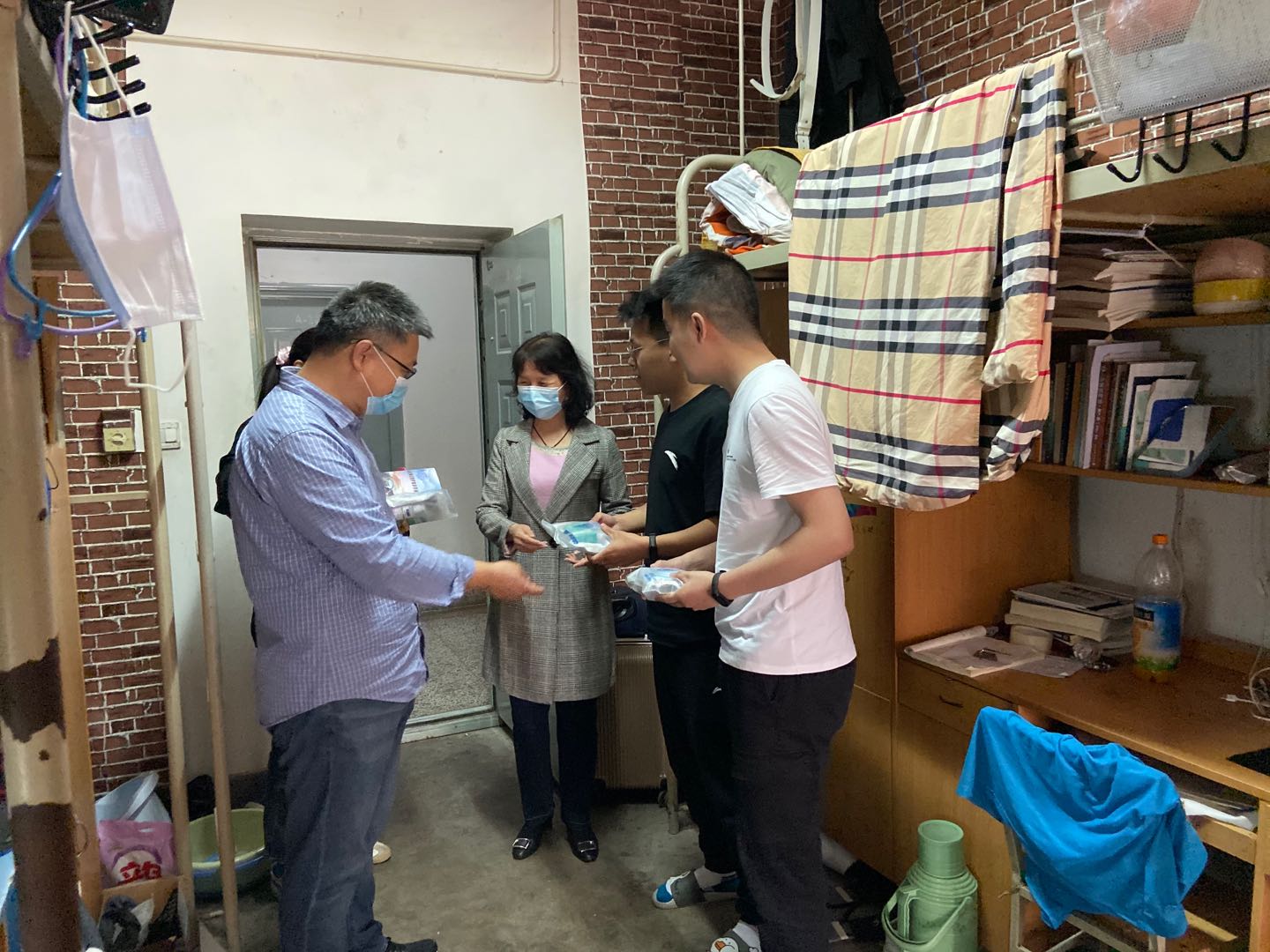 5月10日,在学生宿舍,学院领导与同学们进行了亲切交谈,询问了大家的身体情况、在家学习生活情况、当前就业状况和亟需学院学校协助解决的问题等。王雅慧为每位返校学生送上了学校精心准备的《防疫健康爱心包》,并要求同学们一定要按照《个人疫情防控指南》的相关要求做好个人防护,加强宿舍的通风换气、保持宿舍的清洁卫生。院长薛涛向大家发放了《新冠肺炎防护知识手册》,并嘱咐大家要每日按时晨午检体温、不串门不聚集,静下心来做好毕业设计。