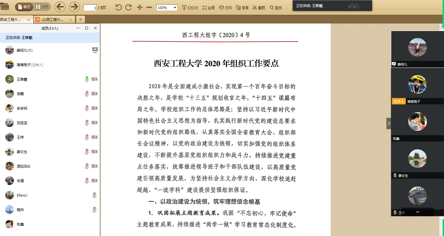 会上,王雅慧首先传达了《西安工程大学2020年组织工作要点》、《关于疫情防控期间在学生中做好发展党员工作的指导意见》等文件精神,并对以上文件进行了解读,对近期党建工作做了安排部署。之后与会成员认真学习了习近平总书记在陕西考察时的重要讲话精神,明确总书记提出的推动经济高质量发展迈出更大步伐、打造内陆改革开放高地、推动生态环境质量持续好转、加强民生保障和社会建设、推动全面从严治党向纵深发展等五项要求。王雅慧要求各党支部要组织党员认真学习习近平总书记在陕西考察时的重要讲话,深刻理解领会习近平总书记重要讲话重要指示的核心要义、精神实质并自觉用以武装头脑,切实推动工作。