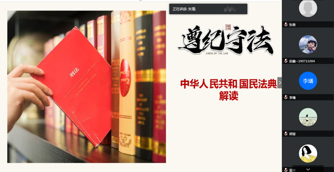 6月17日上午,best365官方网站登录入口研究生第三党支部开展“法治新时代聚焦民法典”线上主题党日活动,在线学习了《中华人民共和国民法典》。会议由党支部书记朱瑾主持。