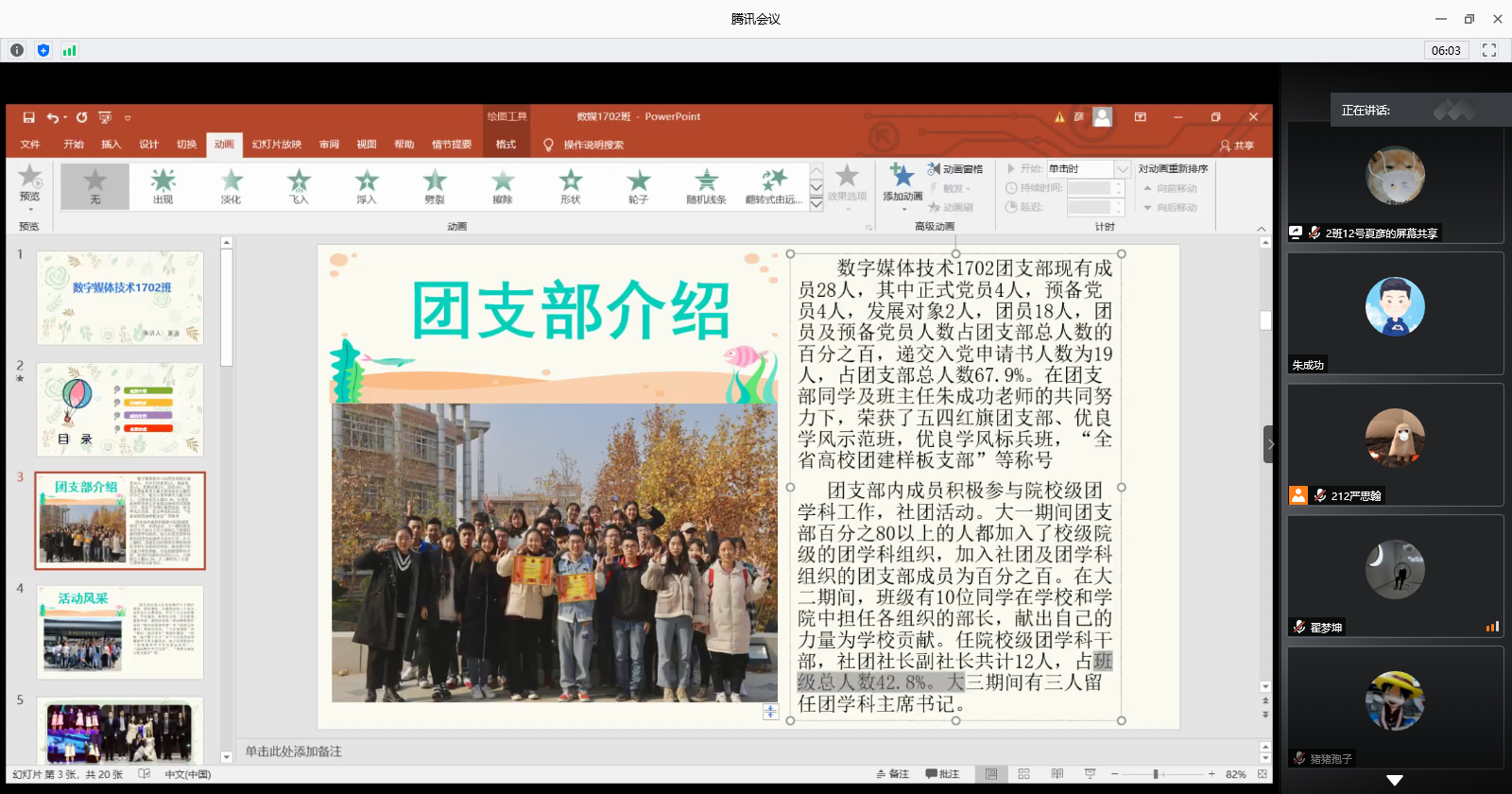 2017级数字媒体02班团支部书记夏彦从团支部基本情况、团日活动风采、团支部成员取得的成绩、团支部管理等方面进行了介绍。他指出正因为团支部青年心往一块想,劲往一起使,每个人在提升自己的同时积极为支部奉献,才取得现在的成绩,今后我们将继续努力奋斗,争取取得更大的成绩。