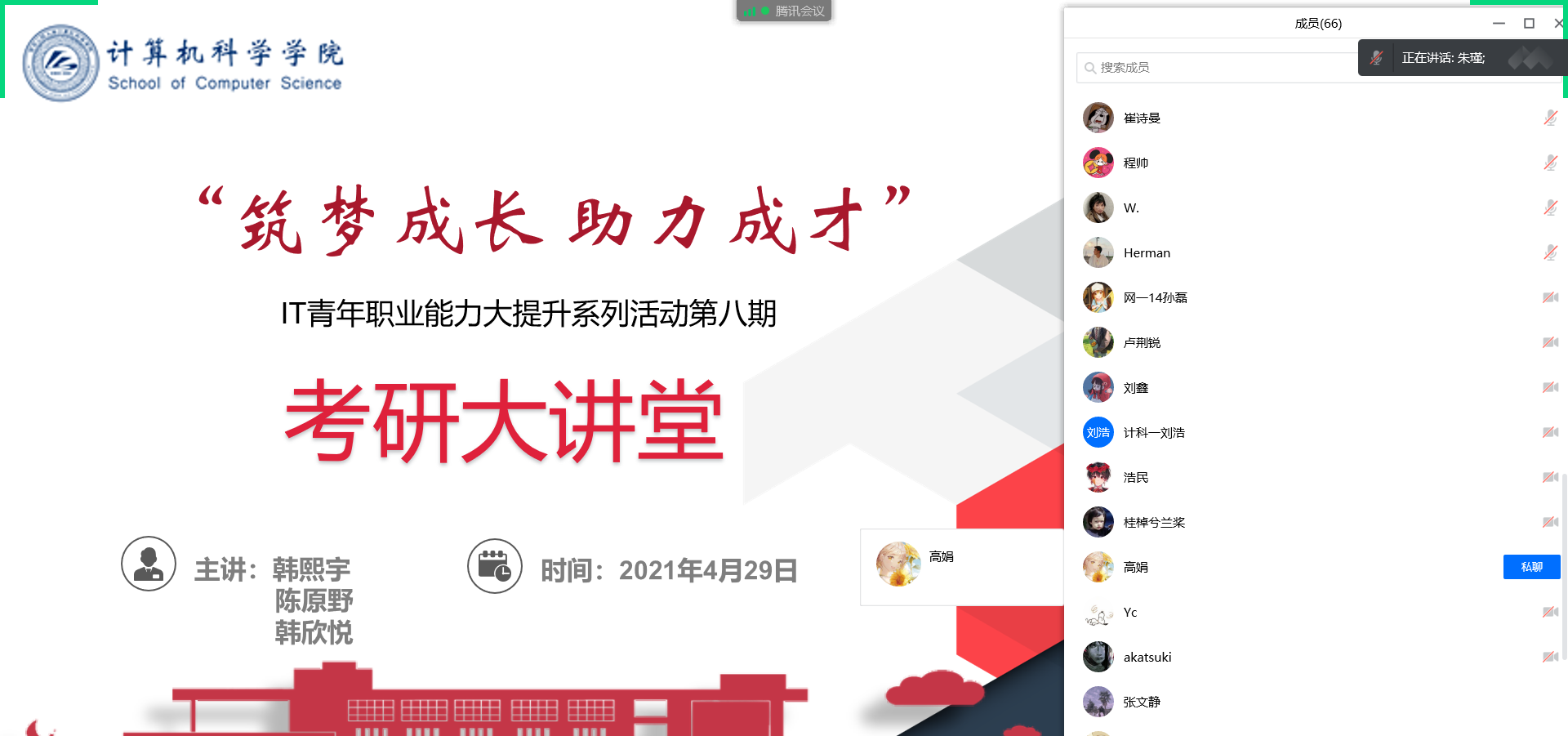 首先,由就读于中国科学技术大学软件学院电子信息专业的韩熙宇同学进行分享,重点为大家分析了考研复试中的英文介绍、专业知识、项目经历等方面注意事项,并且结合学科特点,针对项目经历内容为大家做了详细的分析。就读于西安电子科技大学计算机科学与技术学院电子信息专业的陈原野同学,从宏观的角度介绍了考研复试的流程等内容,针对近两年因疫情的线上面试这一环节进行了重点分析,并结合自己的面试经验向同学们进行分享。最后由跨专业成功上岸的陕西师范大学教育学院的韩欣悦同学,着重讲了搜集信息的重要性,并为大家提供了几个较为重要的搜集渠道。