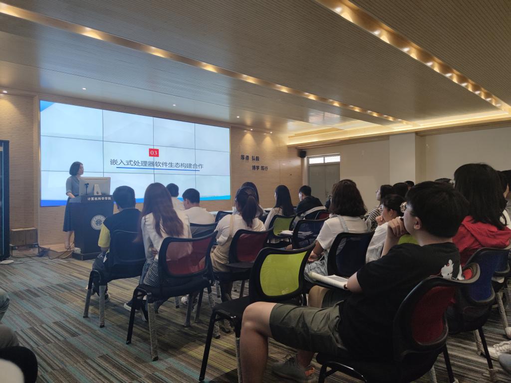 会议伊始,王伟对该公司进行了简单介绍,并就当前我国工业发展面临“卡脖子”的现状和研究生创新实践能力培养的要求进行了讲述。黎小玉围绕嵌入式处理软件生态构建、图形处理器软件生态构建等几个方面,就双方合作研发内容为在场的师生进行了深入地讲解。