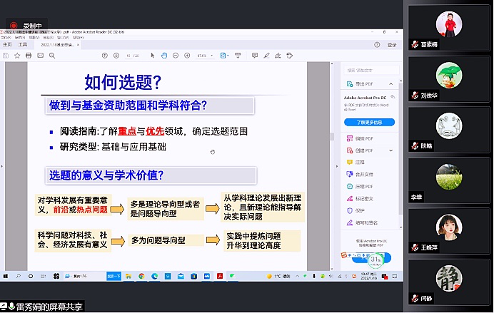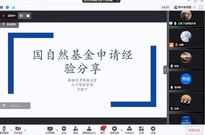 1月18日,为更好地组织我院2022年度国家自然科学基金项目的申报工作,深入解读2022年国家自然科学基金改革的各项新举措,进一步提高国家自然基金申报质量,科技处联合学院在线举办了国家自然科学基金第二轮校内评审会。会议由薛涛院长主持,陕西师范大学雷秀娟教授、西安电子科技大学王晗丁教授受邀作国基申报经验分享。科技处处长朱耀麟、2022年拟申报基金教师及相关工作人员等30余人参加了会议并进行交流讨论。