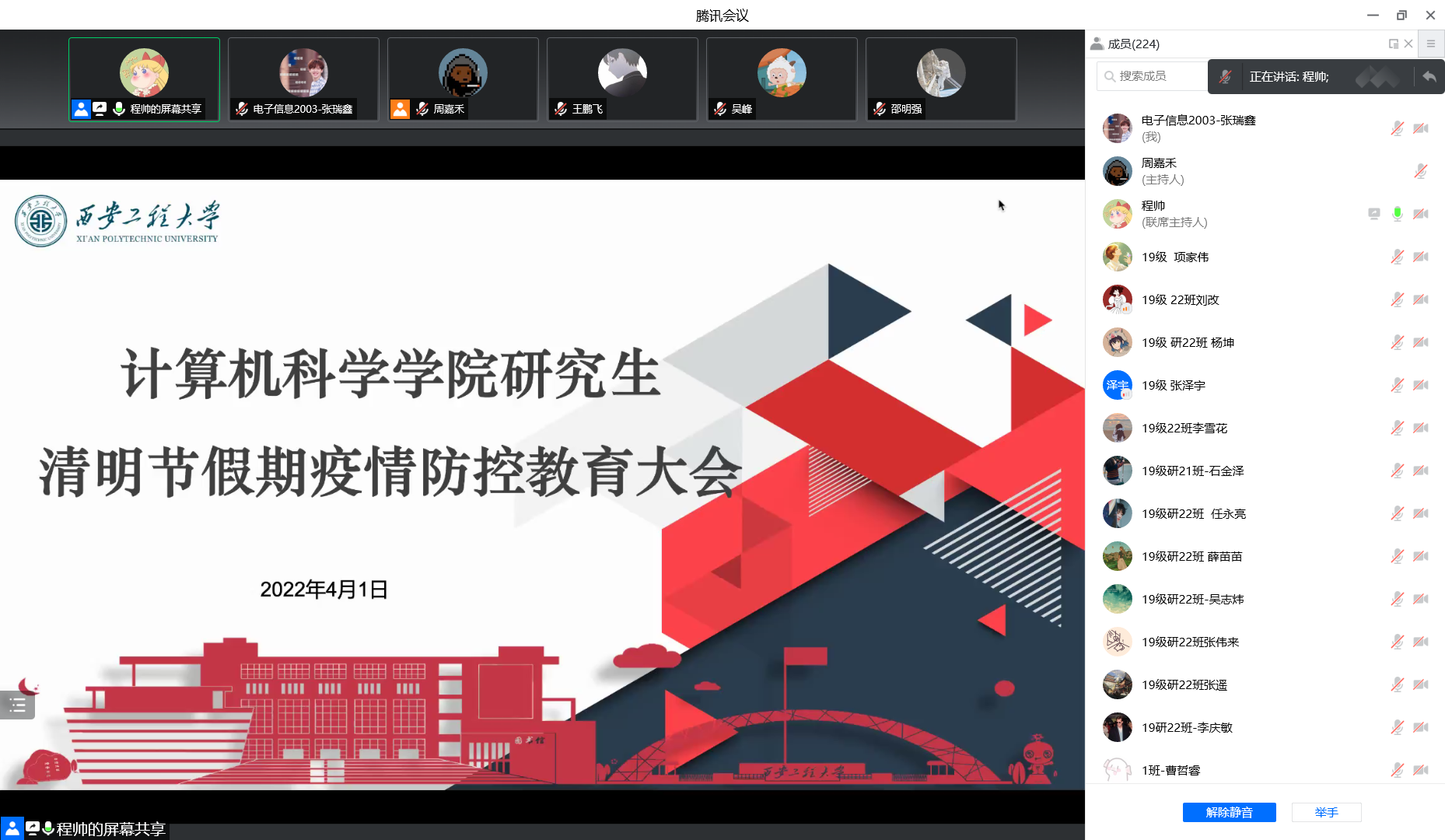 为进一步让学生了解当前疫情防控的严峻形势,提高我院研究生的疫情防范意识,避免新冠疫情校园传播风险,4月1日18点,best365官方网站登录入口在线上召开研究生清明节假期疫情防控教育大会。会议由研究生辅导员程帅主持,全体研究生参加了此次会议。