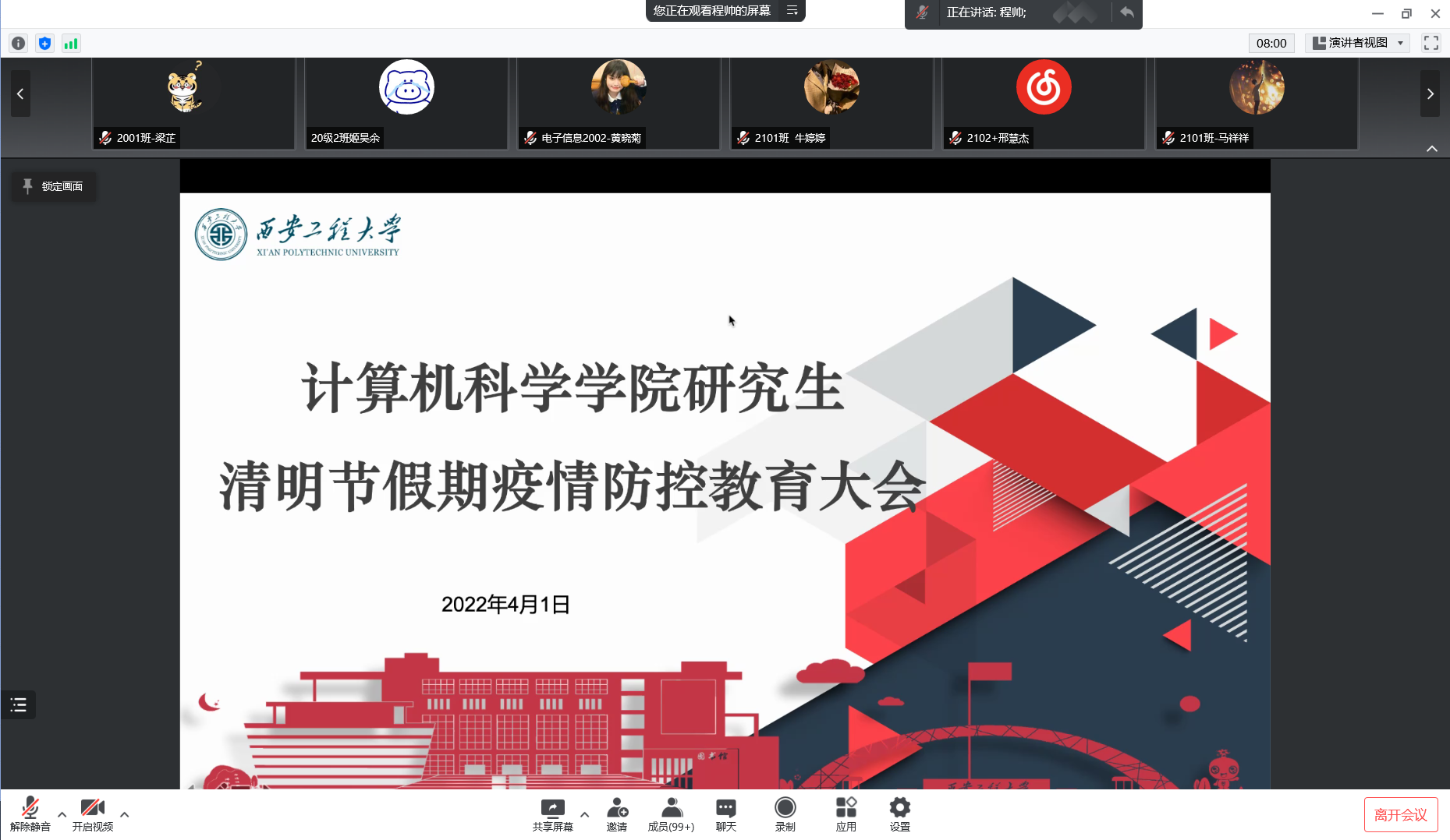 首先,程帅对学校下发的假期疫情防控措施进行了详细解读:原则上非必要不出省,减少跨市流动,坚决避免前往中高风险地区和有本土病例报告的地区;除非导师外派科研、实习等特殊情况,需要填写“地域流动申请表”,线上提交相关手续,获批后方可移动。随后,她对近期线上报备及请假事宜等再次提出要求,她叮嘱所有同学应尽量避免前往人员聚集地,同时出校门一定做好防护,戴好口罩勤洗手。同时,她表示非常理解学生们想要放假回家的心情,但在当前全国疫情形式下,多个地方的疫情仍不容乐观。为了保证大家的生命安全,以及全体师生的集体利益着想,希望大家在疫情的大背景下“少一些抱怨,多一些理解”,担当好这个特殊时期中自己的责任。最后,她祝愿大家度过一个文明、平安的节日假期。