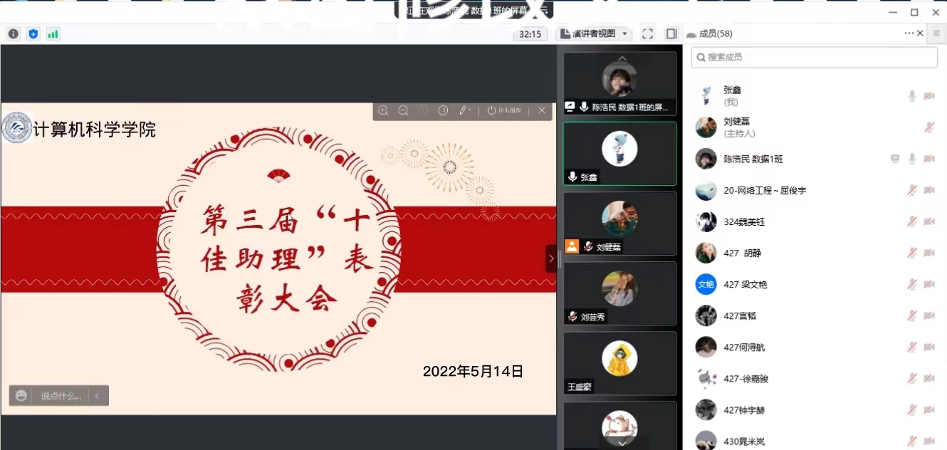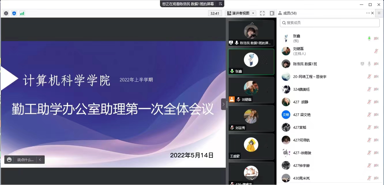 5月14日晚,best365官方网站登录入口通过腾讯会议线上召开了勤工助学办公室助理大会暨第三届“十佳助理”表彰大会。学院资助辅导员左温慧、张鑫及60余名勤工助学办公室助理参加了大会。
