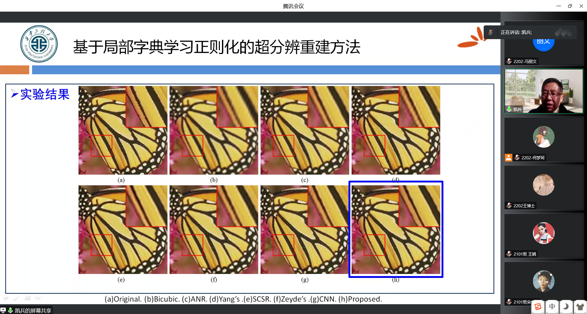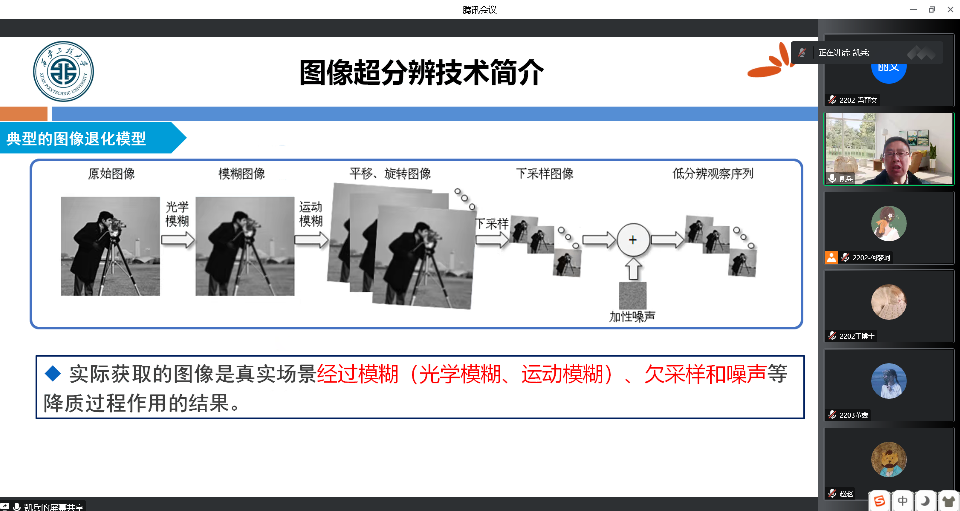 首先,赵勇进介绍了本次报告主讲人张凯兵的基本情况。然后,张凯兵以《图像超分辨及质量评价:从结构学习到深度网络》为题,分别从图像超分辨重建技术的基本原理、结构学习超分辨重建方法、深度学习人脸超分辨方法、超分辨图像质量评价方法四个部分展开讲解,并对图像超分辨面临的挑战问题和未来发展的方向进行了总结。