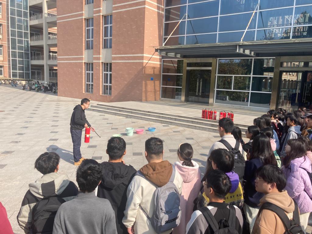 最后是灭火器实操教学环节。学院邀请学校保卫处刘洋老师对灭火器使用规范进行了讲解,并做现场操作示范。同学们也积极参与其中,纷纷动手体验灭火器的正确使用方法。