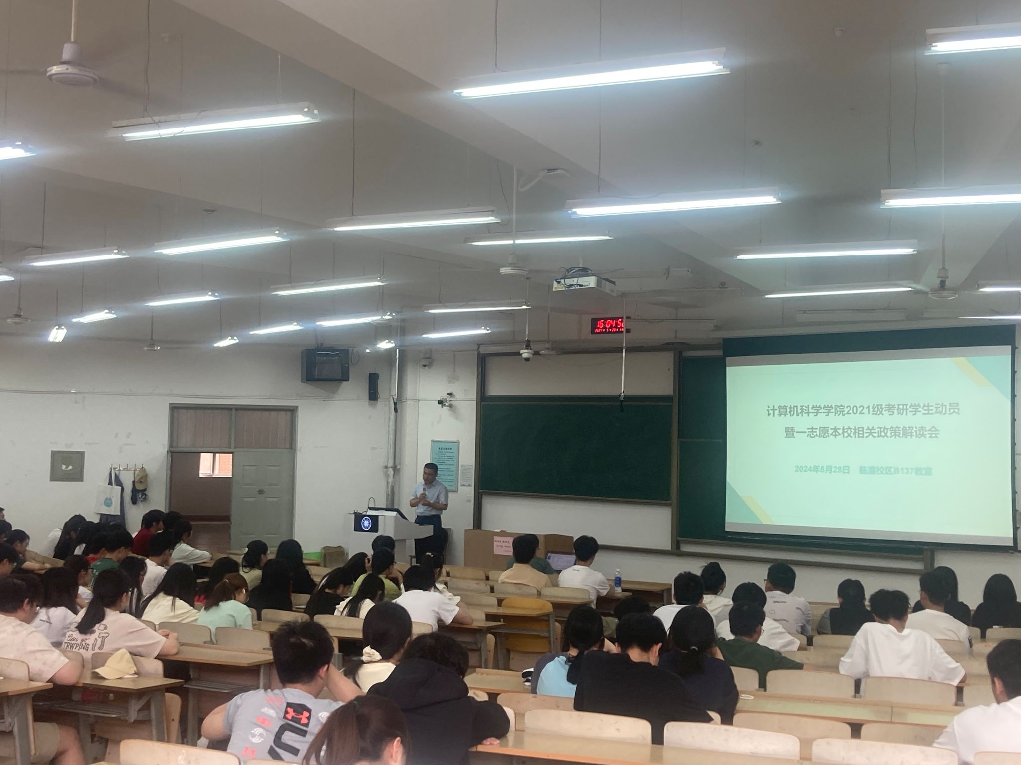 随后,张凯兵做了一志愿报考政策解读。他用丰富详实的数据和生动的实例,从学院研究生师资力量、科研方向、学术氛围、培养机制等方面分析了一志愿报考我院研究生的优势,并对我院历年复试分数线、录取率、初试复试注意事项、计算机类专业全国调剂市场情况等做了讲解。