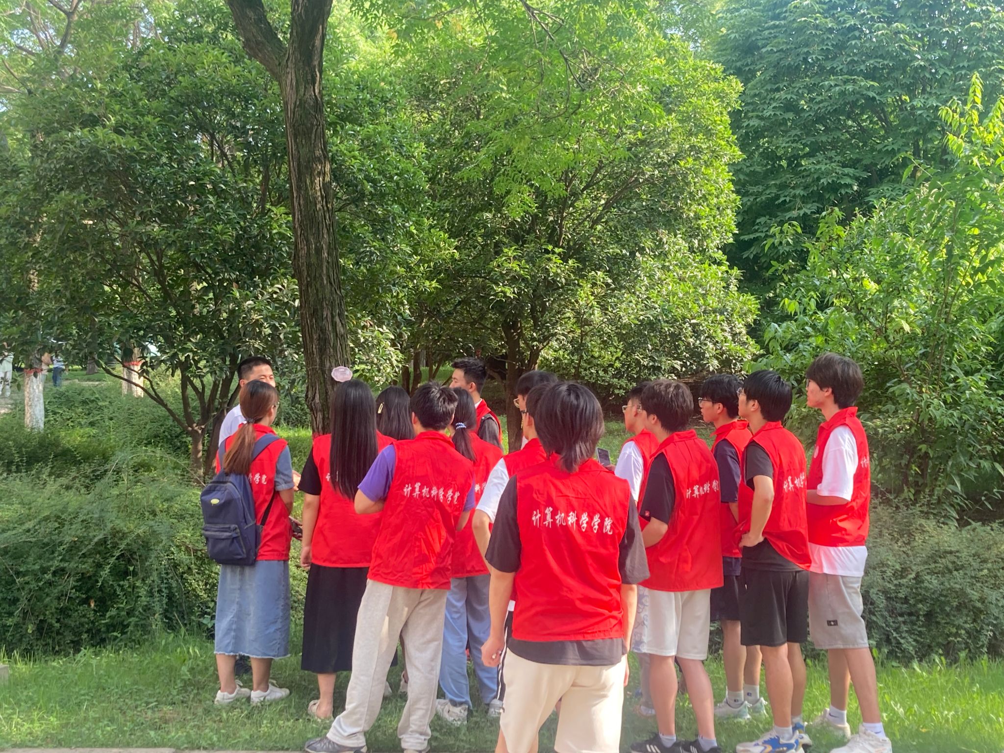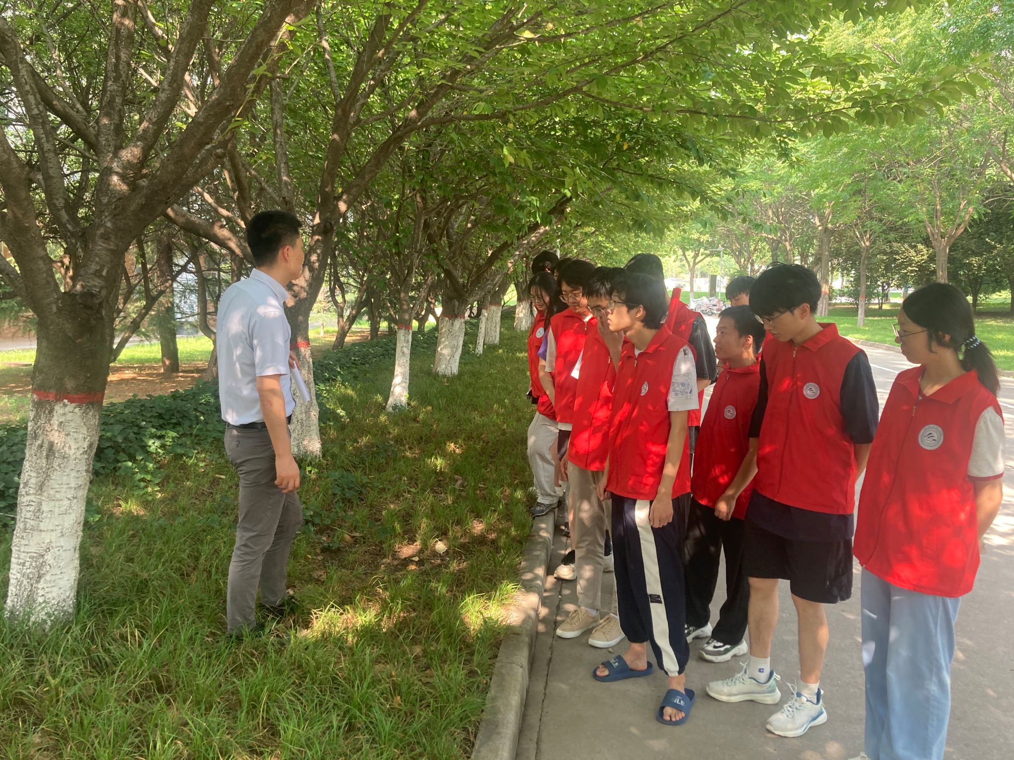 在认知实践环节,朱成功带领同学们在劳动实践区开展了短暂“游学”。林学专业科班出身的他凭借着扎实的林学专业功底向同学们科普了校园林木的种类、花草植被的生长习性以及植物保护方面的知识,还分享了自己在大学期间从事林学专业研究方面的点滴经历与收获心得。