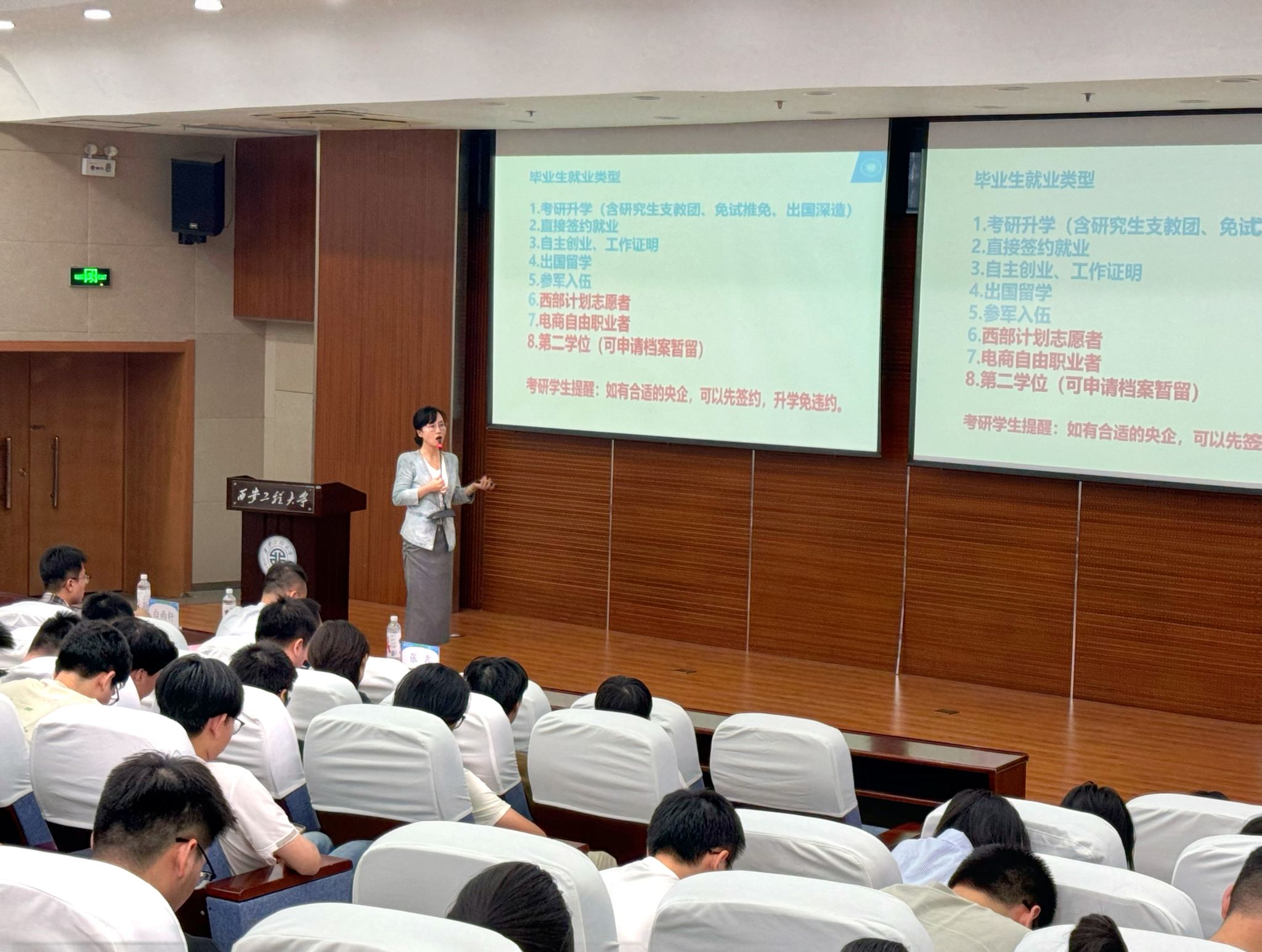 大会伊始,张苹向同学们介绍了就业环境并结合学校、学院相关数据对目前的就业形势进行了分析,希望同学们要树立正确的就业观念,了解行业需求,找到适合自己的职业方向。接着将2024届毕业生就业情况及毕业生网上签约流程做了详细介绍,鼓励同学们积极参加校内外的各类招聘会和就业指导活动,强调同学们要主动适应社会需求,不断增加自身的成本,提高自己的价值。