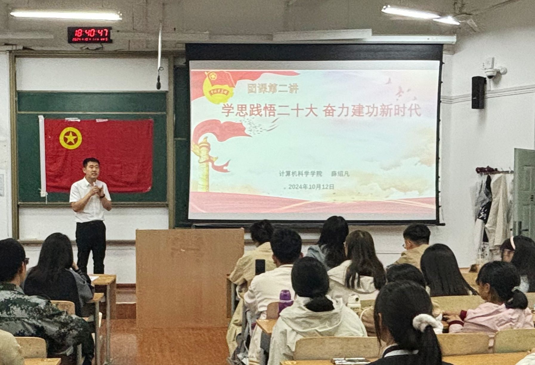 接着,院团委书记薛绍凡讲授了第二讲《学思践悟二十大,奋力建功新时代》。他首先讲授了党的二十大召开的重大历史背景和深远历史意义,接着带领大家回顾了党的百年奋斗历程,教育大家要从历史中汲取智慧和力量。他还结合当前时代背景和青年群体特点阐述了青年在奋力建功新时代过程中所肩负的特殊使命和担当。