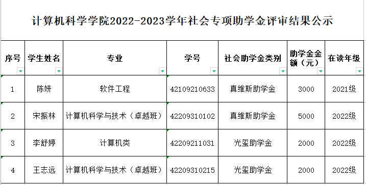 按照学校《关于开展2022-2023学年国家助学金及社会专项助学金评审工作的通知》要求,经学生本人申请、各年级推荐小组推荐、学院学生资助工作领导小组审核认定,本年度我院共推选2人拟获真维斯助学金、2人拟获光玺助学金。现对评审结果予以公示(附详细名单):