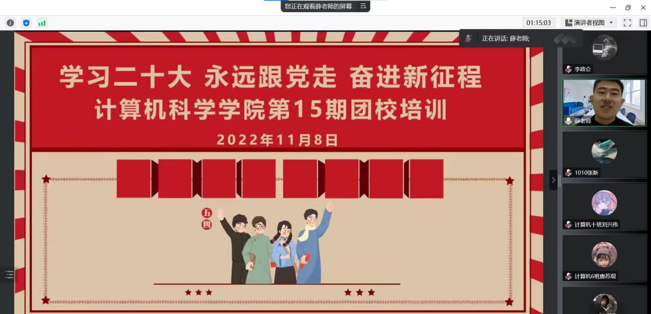 11月7日中午十二点整,best365官方网站登录入口于线上举办了第十五期团校培训。学院党委副书记赵勇进老师,团总支书记薛绍凡老师,研究生辅导员程帅老师,学院辅导员张鑫老师出席了本次会议,22级本科生和研究生团员参加此次会议。
