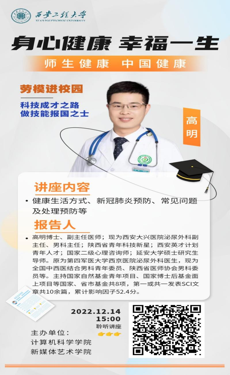 为进一步弘扬劳模精神,劳动精神、工匠精神,充分发挥劳模工匠的示范引领、辐射作用和社会实践“第二课堂”作用,培育和践行社会主义核心价值观,坚持全员育人、全方位育人、全过程育人,助力广大学生成长成才。2022年12月14日下午,best365官方网站登录入口与新媒体艺术学院联合举办了以“科技成才之路做技能报国之士”为主题的劳模工匠进校园活动,特邀请“陕西省青年科技新星”、西安大兴医院高明博士做“师生健康中国健康”专题讲座。两学院师生、学生家长、教职工家属收看了讲座直播。讲座由两个学院党委书记共同主持。